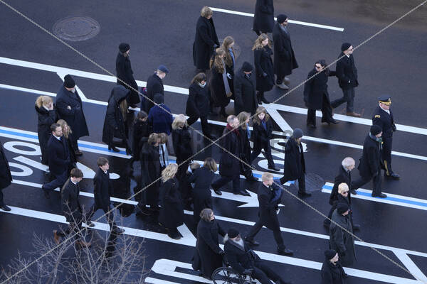 Members of the Carter family march behind the flag-draped casket of former President Jimmy Carter as it travels by a horse-drawn caisson to the Capitol to lie in state in Washington, Tuesday, Jan. 7, 2025. Carter died Dec. 29 at the age of 100