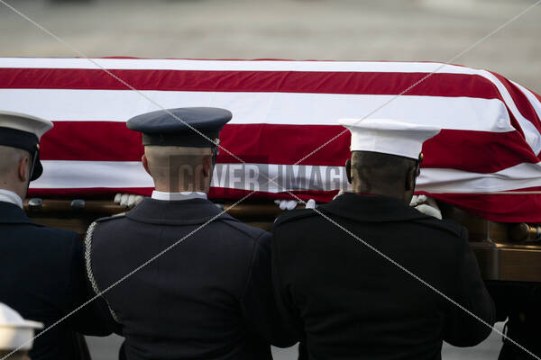 Members of United States Navy transfer the casket of former United States President Jimmy Carter from a hearse to a horse drawn caisson, for a procession from the US Navy Memorial on Pennsylvania Avenue to the US Capitol, that is designed to mirror Carter’s 1977 inaugural parade, in Washington, DC on Tuesday, January 7, 2025. A State Funeral will be held in the late President’s honor before he is buried in Plains, Georgia on Thursday