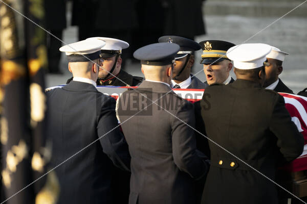 Members of United States Navy transfer the casket of former United States President Jimmy Carter from a hearse to a horse drawn caisson, for a procession from the US Navy Memorial on Pennsylvania Avenue to the US Capitol, that is designed to mirror Carter’s 1977 inaugural parade, in Washington, DC on Tuesday, January 7, 2025. A State Funeral will be held in the late President’s honor before he is buried in Plains, Georgia on Thursday