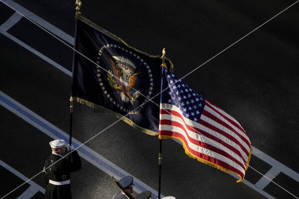 The flag of the President of the United States, left, and the American flag are pictured before the casket of former President Jimmy Carter arrives at the U.S. Navy Memorial before traveling on to the Capitol in Washington, Tuesday, Jan. 7, 2025, where Carter will lie in state. Carter died Dec. 29 at the age of 100