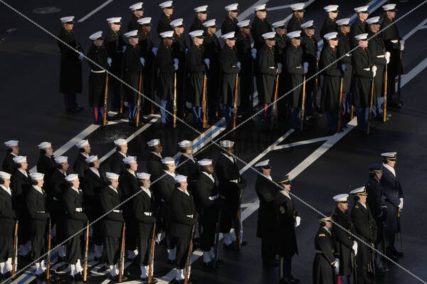 Members of the United States Navy line up to march with the casket of former President Jimmy Carter before it arrives at the U.S. Navy Memorial to travel to the Capitol in Washington to lie in state, Tuesday, Jan. 7, 2025. Carter died Dec. 29 at the age of 100