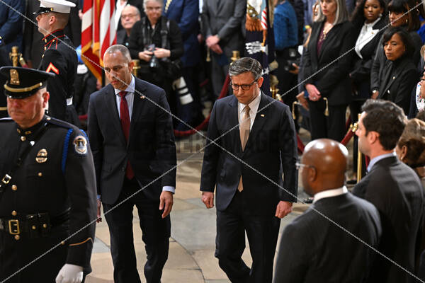 House Minority Leader Hakeem Jeffries (L) and House Speaker Mike Johnson walk away after presenting a wreath on behalf of the Legislative Branch at the Lying in State Ceremony for former President Jimmy Carter at the US Capitol Rotunda in Washington, DC on January 7, 2025. Carter, the 39th President of the United States, died at the age of 100 on December 29, 2024 at his home in Plains, Georgia.