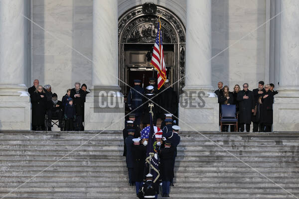 Members of the Carter family look on as U.S. Military joint force pallbearers carry the flag-draped casket of former President Jimmy Carter into the US Capitol in Washington, D.C. on Tuesday, January 7, 2025. Former President Jimmy Carter, the 39th President of the United States, died at the age of 100 on December 29, 2024 at his home in Plains, Georgia.