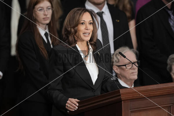 United States Vice President Kamala Harris speaks during a ceremony for former President Jimmy Carter as Carter lies in state at the U.S. Capitol, Tuesday, Jan. 7, 2025, in Washington. Carter died Dec. 29, at the age of 100.