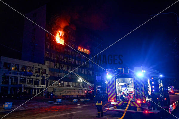 A fire truck is seen outside the building where a fire broke out as a result of an air strike by Russian troops on the industrial infrastructure of Zaporizhzhia