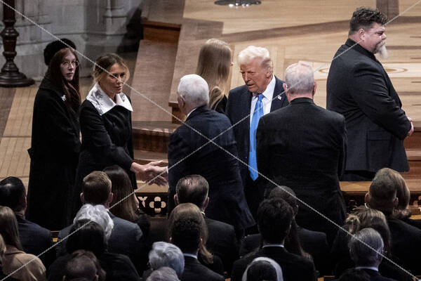 Former Vice President Mike Pence shakes hands with First Lady Melania Trump as President-elect Donald Trump watches as they arrive at National Cathedral in Washington, D.C. for procession before the funeral on Thursday, January 9, 2025
