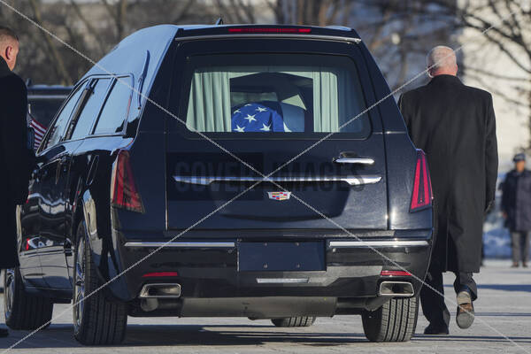 The flag-draped casket of former U.S. President Jimmy Carter is seen in a vehicle during his funeral, in Washington, U.S., January 9, 2025