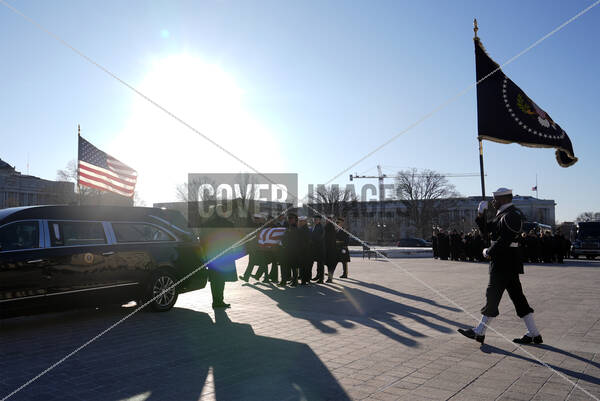 A joint services body bearer team carries the flag-draped casket of former President Jimmy Carter from the U.S. Capitol in Washington, Thursday, Jan. 9, 2025, to head to Washington National Cathedral for a State Funeral