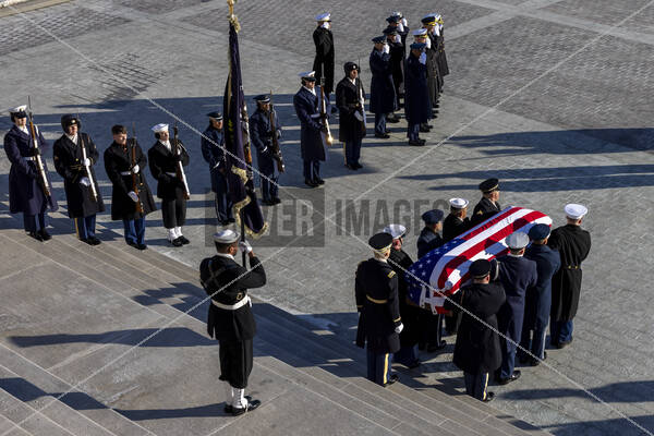 The flag draped casket of former US President Jimmy Carter is carried by a joint services body bearer team out of the of the US Capitol in Washington, DC, USA, 09 January 2025. Following a state funeral at the National Cathedral former President Carter’s remains will return to Plains, Georgia