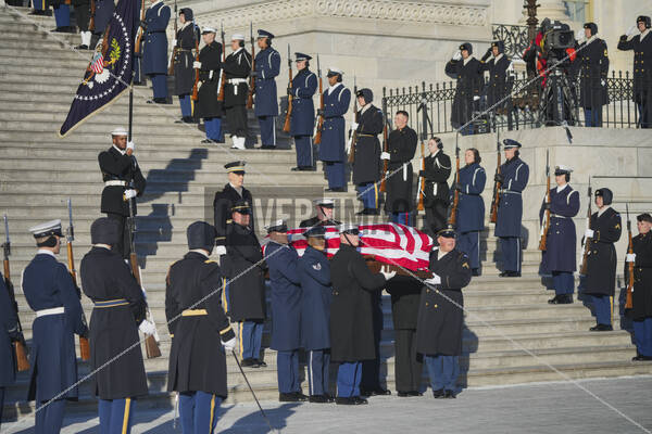 The flag-draped casket of former U.S. President Jimmy Carter is carried by a joint services military honor guard down the steps of the U.S. Capitol in Washington, U.S., January 9, 2025