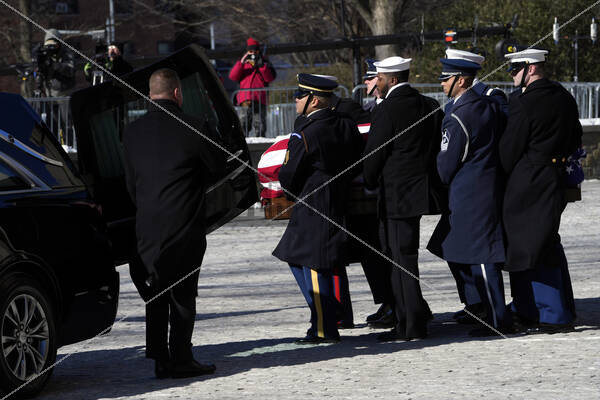A joint services body bearer team carries the flag-draped casket of former President Jimmy Carter to the hearse at Washington National Cathedral