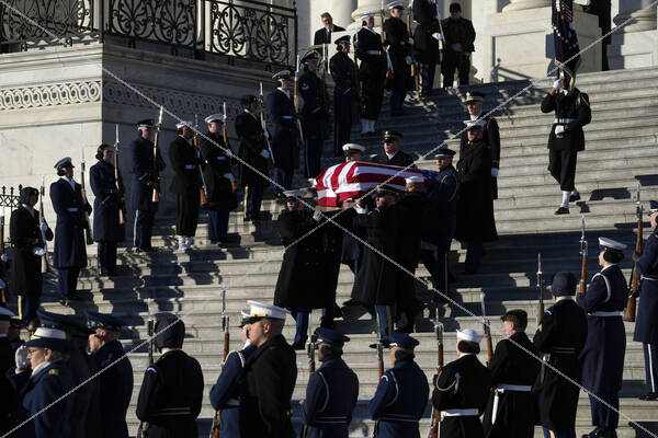 A joint services body bearer team carries the flag-draped casket of former President Jimmy Carter from the U.S. Capitol in Washington, Thursday, Jan. 9, 2025, to head to Washington National Cathedral for a State Funeral.