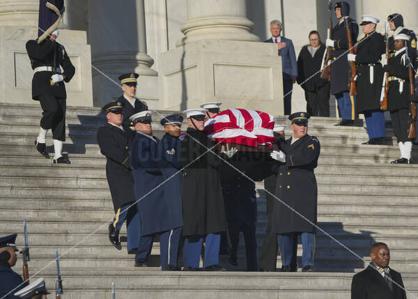 The flag-draped casket of former U.S. President Jimmy Carter is carried by a joint services military honor guard down the steps of the U.S. Capitol in Washington, U.S., January 9, 2025