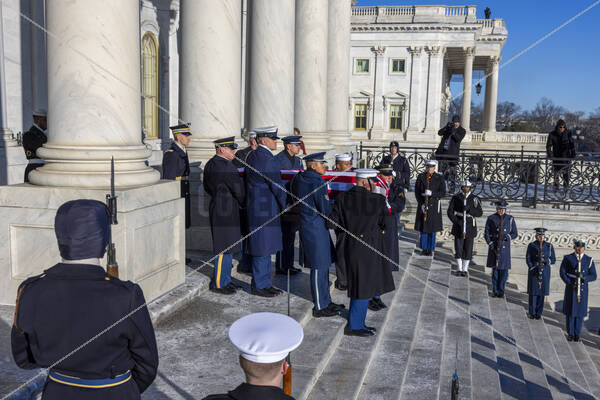 The flag draped casket of former US President Jimmy Carter is carried by a joint services body bearer team out of the of the US Capitol in Washington, DC, USA, 09 January 2025. Following a state funeral at the National Cathedral former President Carter’s remains will return to Plains, Georgia