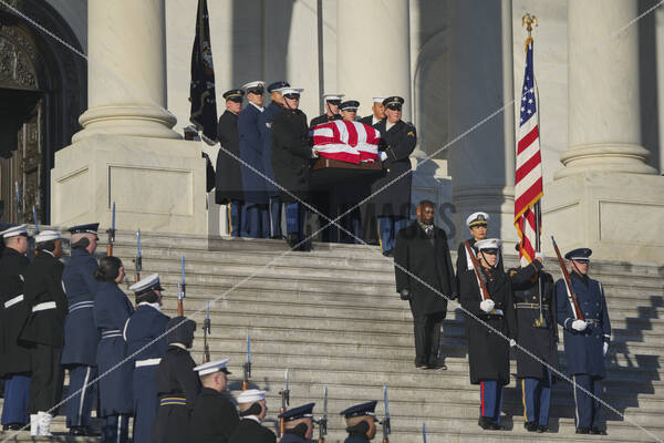 The flag-draped casket of former U.S. President Jimmy Carter is carried by a joint services military honor guard down the steps of the U.S. Capitol in Washington, U.S., January 9, 2025