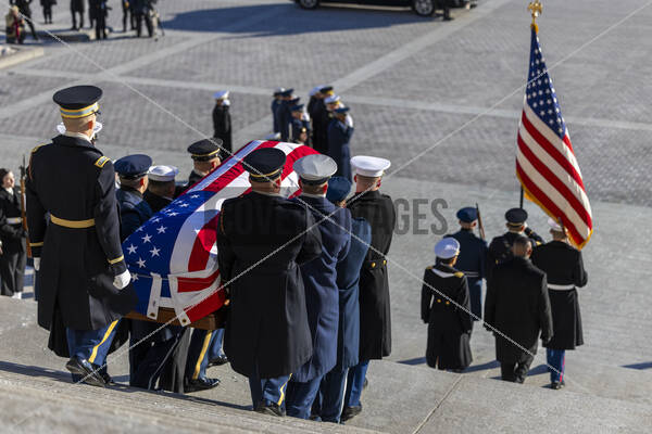 The flag draped casket of former US President Jimmy Carter is carried by a joint services body bearer team out of the of the US Capitol in Washington, DC, USA, 09 January 2025. Following a state funeral at the National Cathedral former President Carter’s remains will return to Plains, Georgia