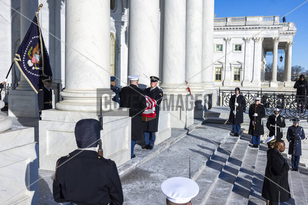The flag draped casket of former US President Jimmy Carter is carried by a joint services body bearer team out of the of the US Capitol in Washington, DC, USA, 09 January 2025. Following a state funeral at the National Cathedral former President Carter’s remains will return to Plains, Georgia