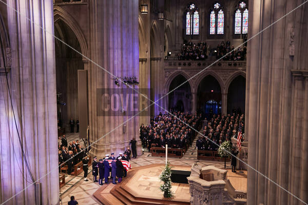A coffin carrying former President Jimmy Carter is covered in the American flag and brought to the altar during the State Funeral for former President Jimmy Carter held at the National Cathedral in Washington, DC. on January 9, 2025