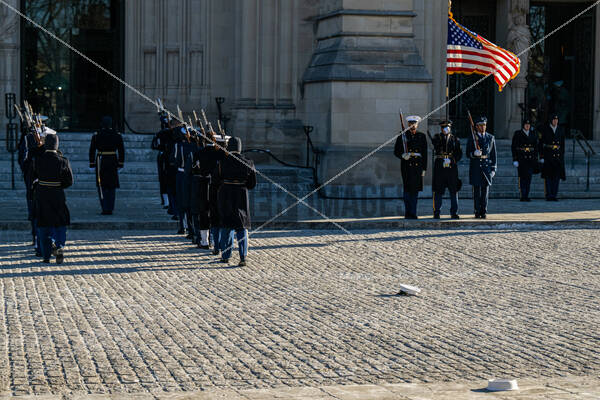 Hats of the Honor Guard are blown off in the wind at the State Funeral Service honoring former United States President Jimmy Carter at the Washington National Cathedral in Washington, DC on Thursday, January 9, 2025. The late President will be laid to rest later today in his hometown of Plains, Georgia