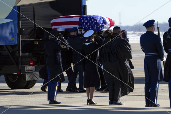The flag-draped casket of former President Jimmy Carter is carried by a joint services body bearer team to Special Air Mission 39, at Joint Base Andrews