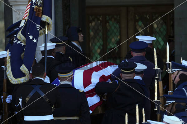 A joint services body bearer team carries the flag-draped casket of former President Jimmy Carter Washington National Cathedral in Washington, Thursday, Jan. 9, 2025, for a state funeral