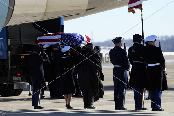 The flag-draped casket of former President Jimmy Carter is carried by a joint services body bearer team to Special Air Mission 39, at Joint Base Andrews