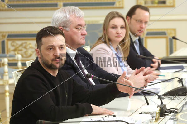 PersonInImage: President of Ukraine Volodymyr Zelenskyy and Minister for Foreign Affairs of Ukraine Andrii Sybiha (L to R) are pictured during a meeting with OSCE Chairperson-in-Office, Minister for Foreign Affairs of Finland Elina Valtonen