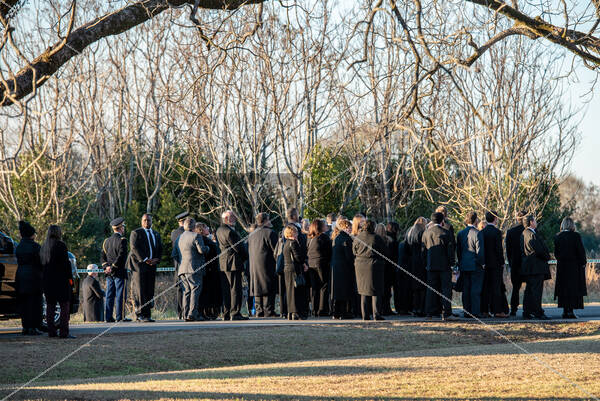 Guests watch United States Navy F/A-18 Hornets perform a fly-over and ceremonial military service honoring former US President Jimmy Carter at the Maranatha Baptist Church in his hometown
