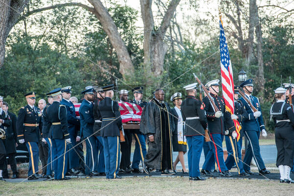 Pastor Tony Lowden walks in front of United States service members carrying the casket of former US President Jimmy Carter at the Maranatha Baptist Church in his hometown