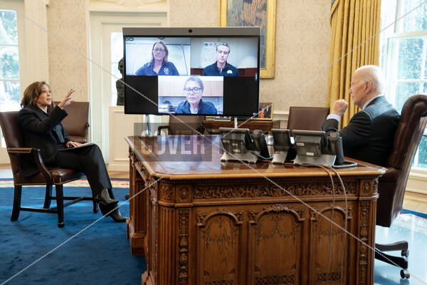 United States President Joe Biden, joined by US Vice President Kamala Harris and White House Homeland Security Advisor Liz Sherwood-Randall, and on video screen Governor Gavin Newsom (Democrat of California), Mayor Karen Bass (Democrat of Los Angeles, California), and FEMA Administrator Deanne Criswell, convenes officials for a briefing on the federal response to the wildfires in Los Angeles in the Oval Office at the White House