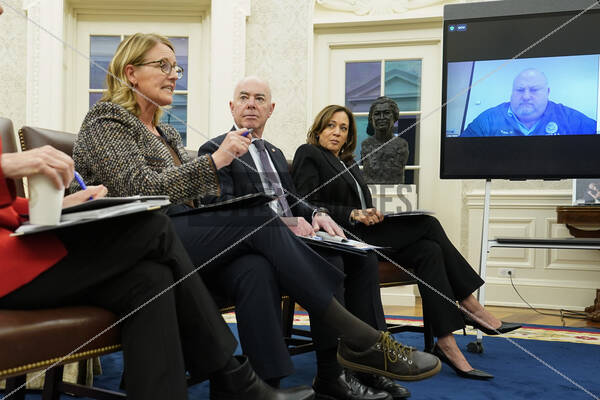 PersonInImage: FEMA administrator Deanne Criswell (L) speaks during a meeting with Secretary of Homeland Security, Alejandro Mayorkas (C) and United States Vice President Kamala Harris (R)