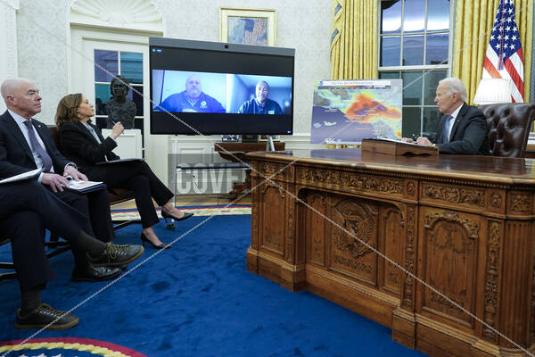 PersonInImage: Secretary of Homeland Security, Alejandro Mayorkas and United States Vice President Kamala Harris participate in a meeting with Regional Administrator Robert Fenton, Region 9, Federal Emergency Management Agency, Chief Randy Moore, U.S. Forest Service and United States President Joe Biden