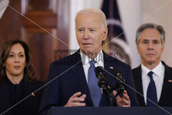 United States President Joe Biden gives remarks as US Vice President Kamala Harris and US Secretary of State Antony Blinken look on, in the Entrance Hall of the White House in Washington DC, on Wednesday, January 15, 2025. Israel and Hamas announced they had come to a ceasefire and hostage deal.