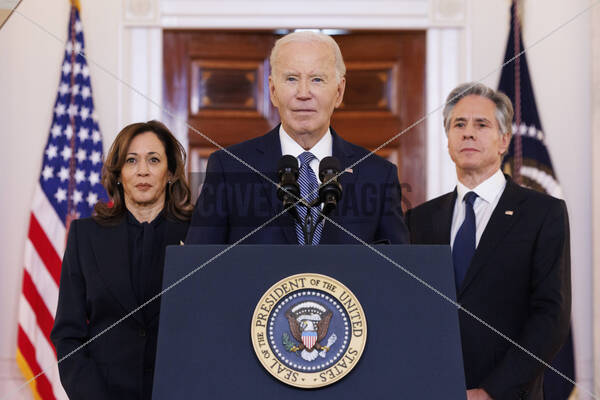 United States President Joe Biden gives remarks as US Vice President Kamala Harris and US Secretary of State Antony Blinken look on, in the Entrance Hall of the White House in Washington DC, on Wednesday, January 15, 2025. Israel and Hamas announced they had come to a ceasefire and hostage deal.
