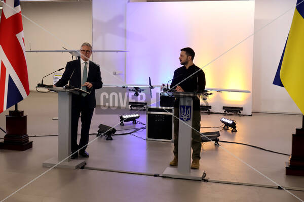 President of Ukraine Volodymyr Zelenskyy (R) and Prime Minister of the United Kingdom Keir Starmer partake in a joint press conference as part of the presentation of drones created by Ukrainian manufacturers, Kyiv, capital of Ukraine