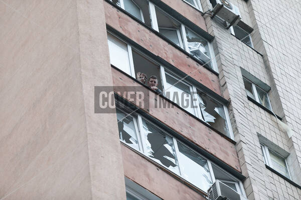 Keywords: Ukraine conflict,Russian invasion,Ukraine war,war,conflict,Russia-Ukraine war,aftermath,emergency,ballistic missile,missile attack,Kyiv,wave,window,apartment block,man,woman,cheer