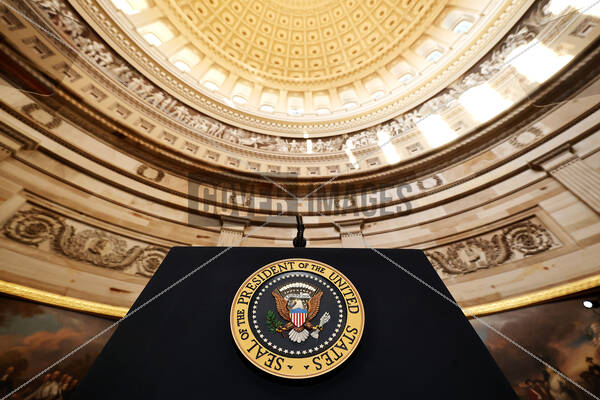 The podium stands ahead of inauguration ceremonies for U.S. President-elect Donald Trump in the Rotunda of the U.S. Capitol on January 20, 2025 in Washington, DC. Donald Trump takes office for his second term as the 47th president of the United States