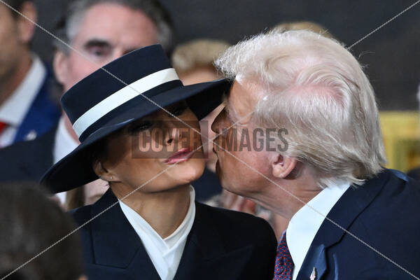 US President-elect Donald Trump kisses Melania Trump as he arrives for the inauguration ceremony before he is sworn in as the 47th US President in the US Capitol Rotunda in Washington, DC