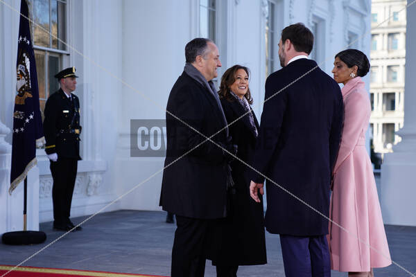 Vice President Kamala Harris (2L) and Second Gentleman Doug Emhoff (L) greet Vice President Elect JD Vance (2R) and Usha Vance (R) at the White House during inauguration ceremonies for US President Donald Trump in Washington, DC, USA, 20 January 2025. Trump, who defeated Vice President Kamala Harris in the 2024 general election, is being sworn in today as the 47th president of the United States, though the planned outdoor ceremonies and events have been cancelled due to a forecast of extreme cold temperatures