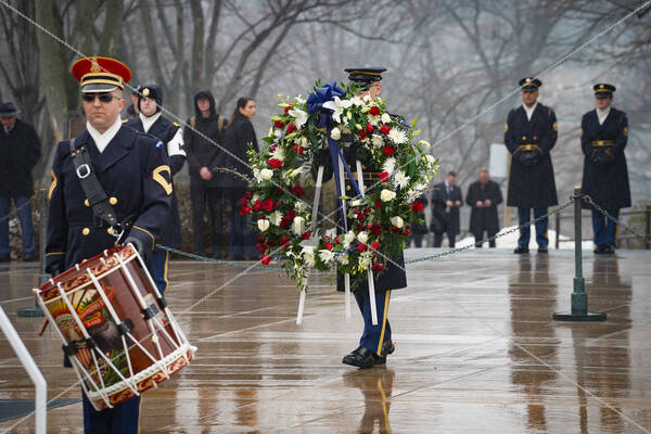 A member of the Tomb Guards at the Tomb of the Unknown Soldier participates in a wreath laying ceremony at Arlington National Cemetery January 19, 2025. The Tomb Guards have conducted uninterrupted 24 hour operations, year round since 1937 to maintain security and honor at the Tomb.