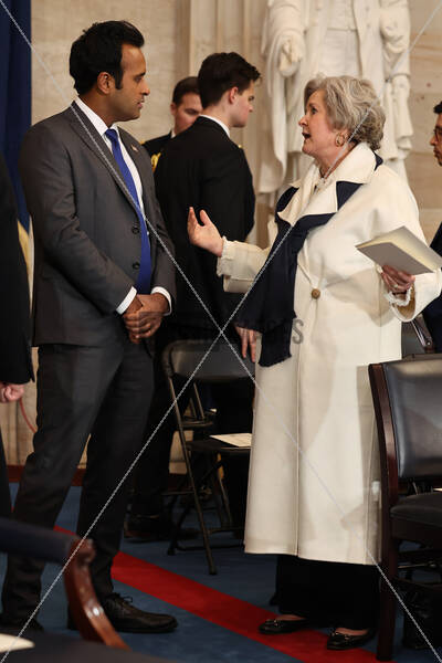 Businessman Vivek Ramaswamy speaks with U.S. President-elect Donald Trump's Chief of Staff Susie Wiles as they arrive to inauguration ceremonies in the Rotunda of the U.S. Capitol on January 20, 2025 in Washington, DC. Donald Trump takes office for his second term as the 47th president of the United States