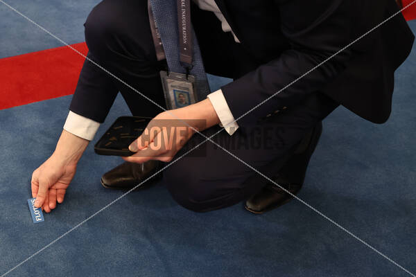 A staff member places a marker for the first lady ahead of the inauguration of U.S. President-elect Donald Trump in the Rotunda of the U.S. Capitol on January 20, 2025 in Washington, DC. Donald Trump takes office for his second term as the 47th president of the United States