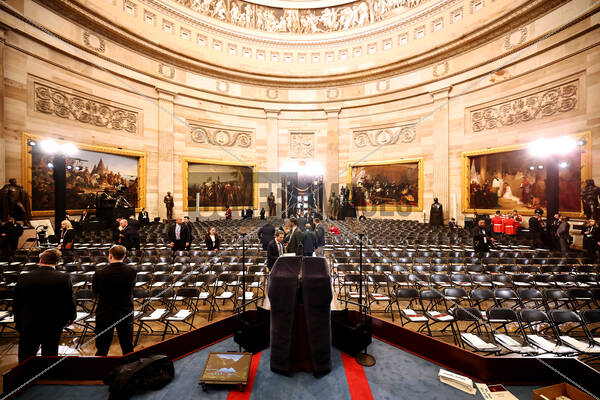 Staff prepare for the inauguration of U.S. President-elect Donald Trump in the U.S. Capitol Rotunda on January 20, 2025 in Washington, DC. Donald Trump takes office for his second term as the 47th president of the United States