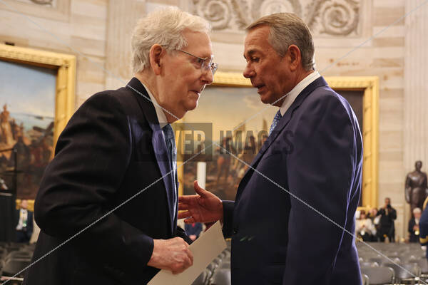 U.S. Sen. Mitch McConnell (R-KY) (L) speaks with former U.S. Speaker of the House John Boehner as they arrive to the inauguration of U.S. President-elect Donald Trump in the Rotunda of the U.S. Capitol on January 20, 2025 in Washington, DC. Donald Trump takes office for his second term as the 47th president of the United States