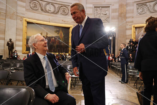 U.S. Sen. Mitch McConnell (R-KY) (L) speaks with former U.S. Speaker of the House John Boehner as they arrive to the inauguration of U.S. President-elect Donald Trump in the Rotunda of the U.S. Capitol on January 20, 2025 in Washington, DC. Donald Trump takes office for his second term as the 47th president of the United States