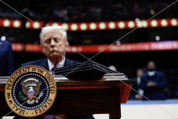 U.S. President Donald Trump signs executive orders during an indoor inauguration parade at Capital One Arena on January 20, 2025 in Washington, DC. Donald Trump takes office for his second term as the 47th president of the United States