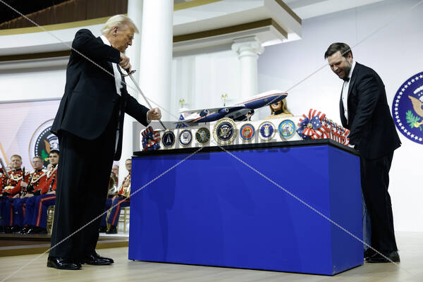President Donald Trump and Vice President JD Vance use swords to cut the cake at the Commander-in-Chief Ball on January 20, 2025 in Washington, DC. President Trump attends some of the inaugural balls after taking the oath as the 47th president.