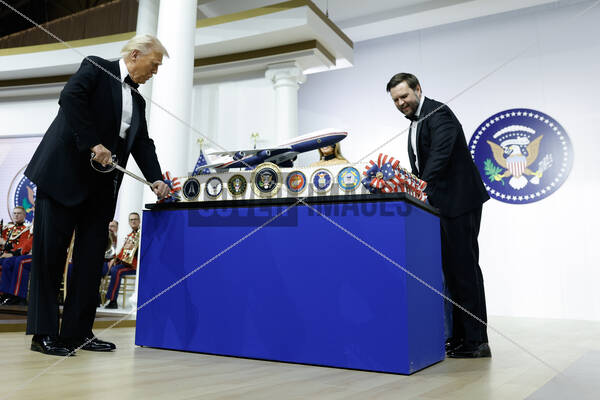 President Donald Trump and Vice President JD Vance use swords to cut the cake at the Commander-in-Chief Ball on January 20, 2025 in Washington, DC. President Trump attends some of the inaugural balls after taking the oath as the 47th president.