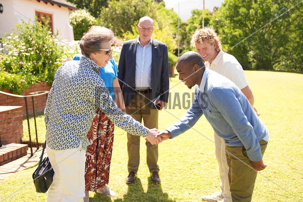 The Princess Royal shakes hands with Bulelani Bashe, head horticulturist at Grootbos Foundation as Leon Kluge, gold winner at the 2024 Chelsea Flower Show (right) watches on, during a visit to the British High Commission Residence garden in Pretoria, while on her two-day to trip to South Africa.