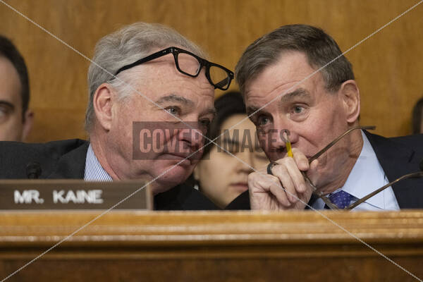 United States Senator Tim Kaine (Democrat of Virginia) and US Senator Mark Warner (Democrat of Virginia in discussion prior to Russell Vought giving testimony before the United States Senate Committee on the Budget on his nomination to be Director, Office of Management and Budget (OMB) in the Dirksen Senate Office Building on Capitol Hill
